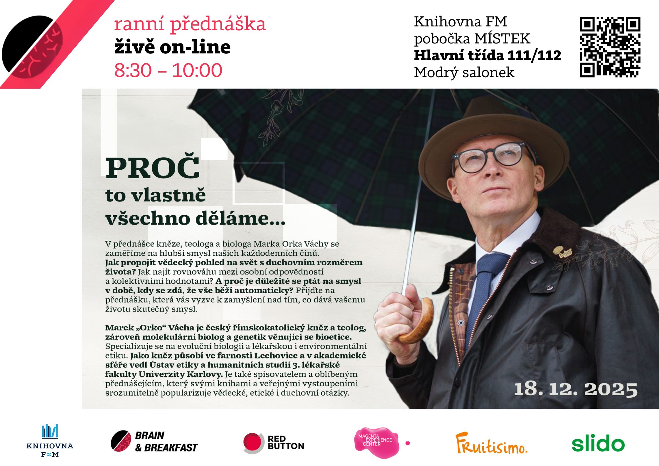 V přednášce kněze, teologa a biologa Marka Orko Váchy se zaměříme na hlubší smysl našich každodenních činů. Jak propojit vědecký pohled na svět s duchovním rozměrem života? Jak najít rovnováhu mezi osobní odpovědností a kolektivními hodnotami? A proč je důležité se ptát na smysl v době, kdy se zdá, že vše běží automaticky?