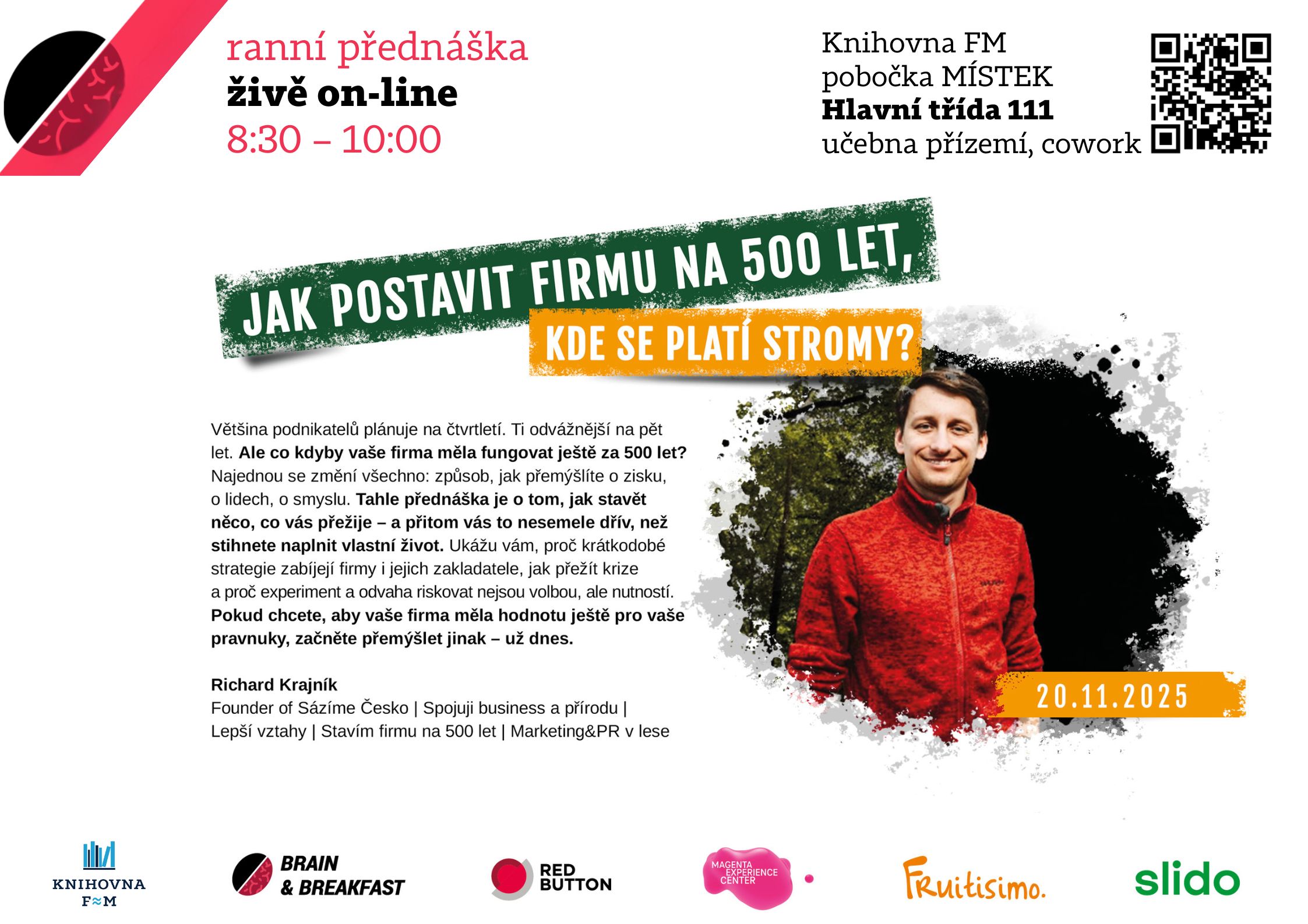 Většina podnikatelů plánuje na čtvrtletí. Ti odvážnější na pět let. Ale co kdyby vaše firma měla fungovat ještě za 500 let? Najednou se změní všechno: způsob, jak přemýšlíte o zisku, o lidech, o smyslu. Tahle přednáška je o tom, jak stavět něco, co vás přežije – a přitom vás to nesemele dřív, než stihnete naplnit vlastní život. Náš host vám ukáže, proč krátkodobé strategie zabíjejí firmy i jejich zakladatele, jak přežít krize a proč experiment a odvaha riskovat nejsou volbou, ale nutností. Pokud chcete, aby vaše firma měla hodnotu ještě pro vaše pravnuky, začněte přemýšlet jinak – už dnes.