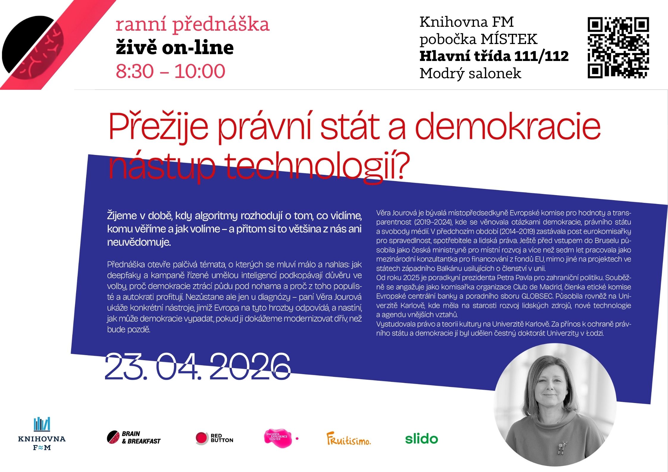 Nezůstane ale jen u diagnózy – paní Věra Jourová ukáže konkrétní nástroje, jimiž Evropa na tyto hrozby odpovídá, a nastíní, jak může demokracie vypadat, pokud ji dokážeme modernizovat dřív, než bude pozdě.