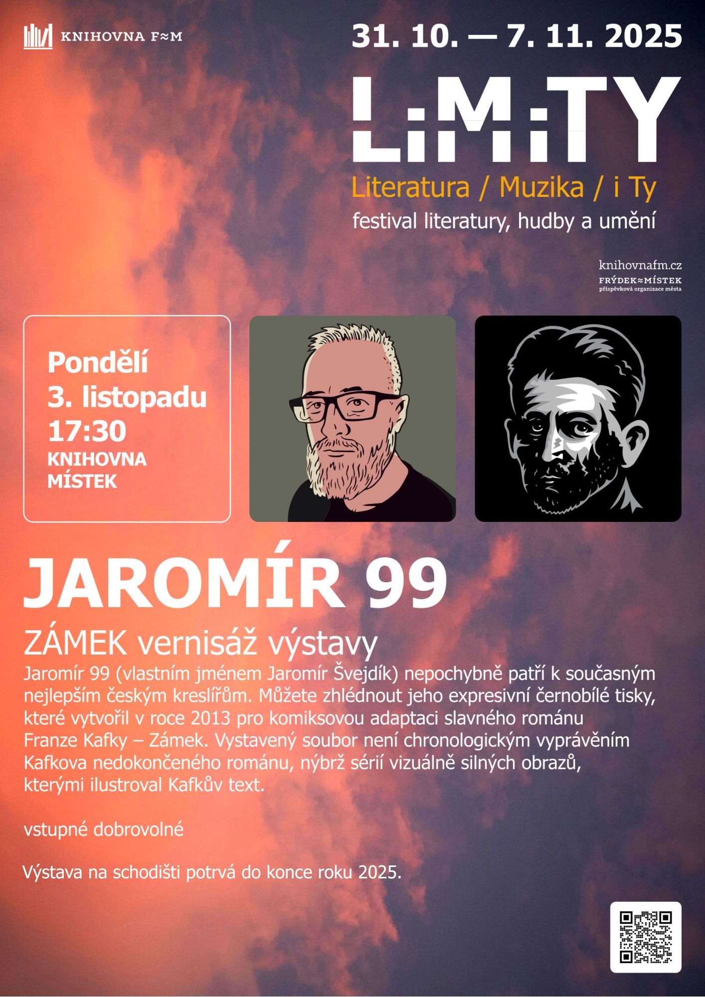 Jaromír 99 (vlastním jménem Jaromír Švejdík) nepochybně patří k současným nejlepším českým kreslířům. Je autorem množství ilustrací a několika komiksových románů. Expresivní černobílé tisky, které vytvořil v roce 2013 pro komiksovou adaptaci slavného románu Franze Kafky – Zámek, byly poprvé vystaveny v roce 2020 v rámci festivalu Frýdlantsko Franze Kafky. Vystavený soubor není chronologickým vyprávěním Kafkova nedokončeného románu, nýbrž sérií vizuálně silných obrazů, kterými ilustroval Kafkův text. Osamělý K. se svou poutnickou holí přišel odnikud. Kdesi v mracích se mu zjevuje zámek. Neuchopitelný, nepopsatelný, ale krásně magický a tajemný.
