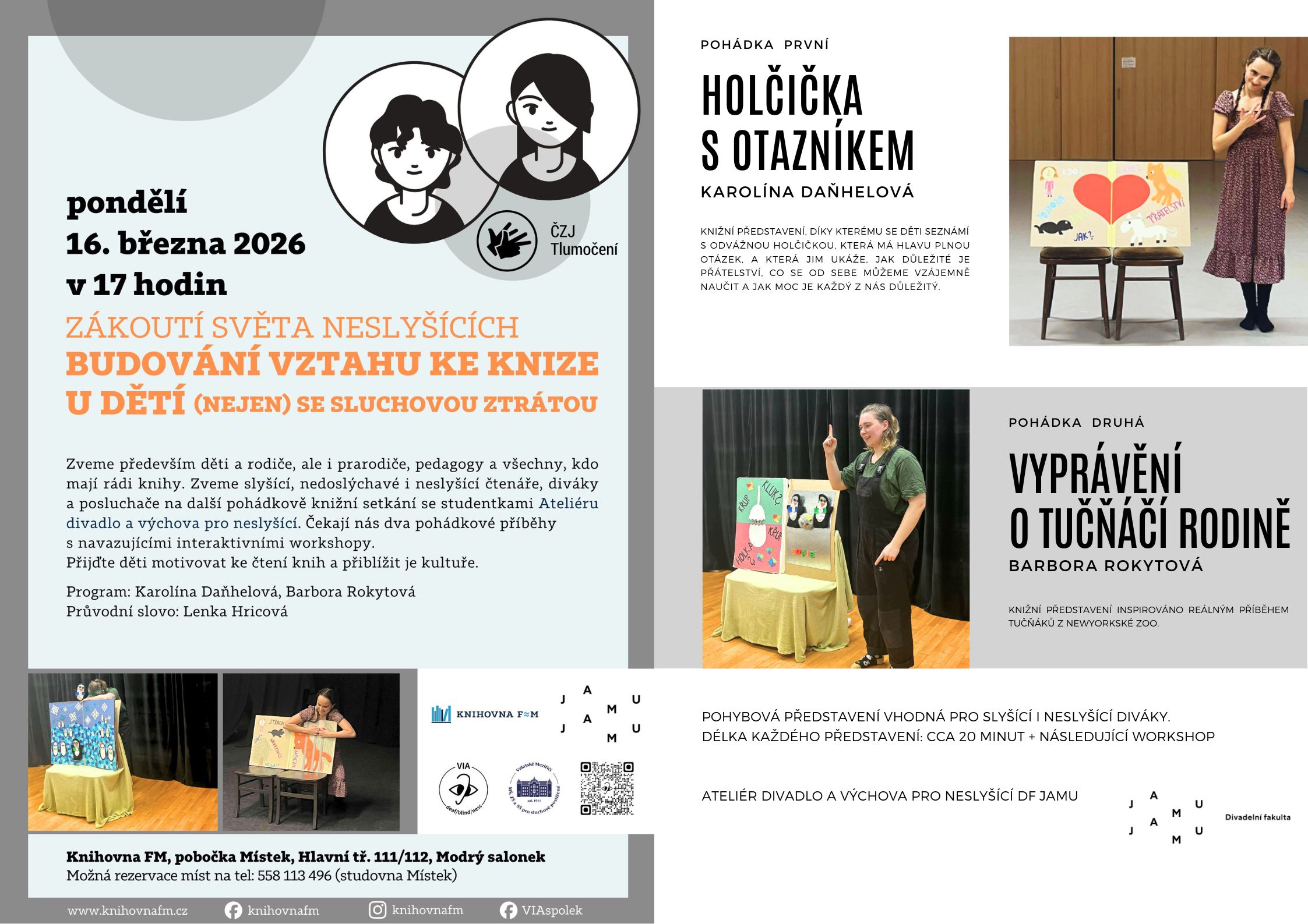 Zveme především děti a rodiče, ale i prarodiče, pedagogy a všechny, kdo mají rádi knihy. Zveme slyšící, nedoslýchavé i neslyšící čtenáře, diváky a posluchače na další pohádkově knižní setkání se studentkami Ateliéru divadlo a výchova pro neslyšící. Čekají nás dva pohádkové příběhy s navazujícími interaktivními workshopy. Přijďte děti motivovat ke čtení knih a přiblížit je kultuře.