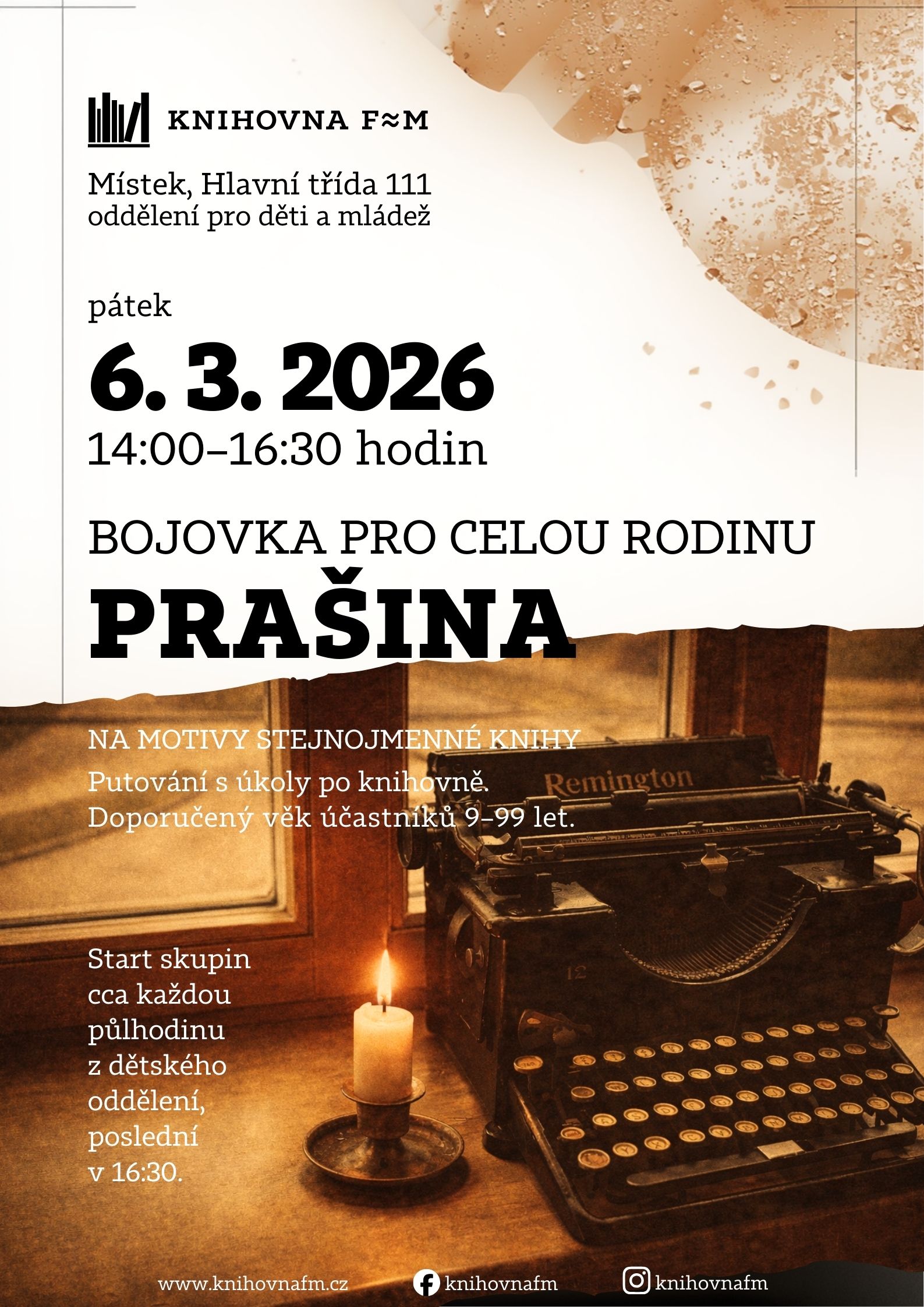 Putování s úkoly po knihovně. Doporučený věk účastníků 9–99 let. Start skupin cca každou půlhodinu z dětského oddělení, poslední v 16:30.