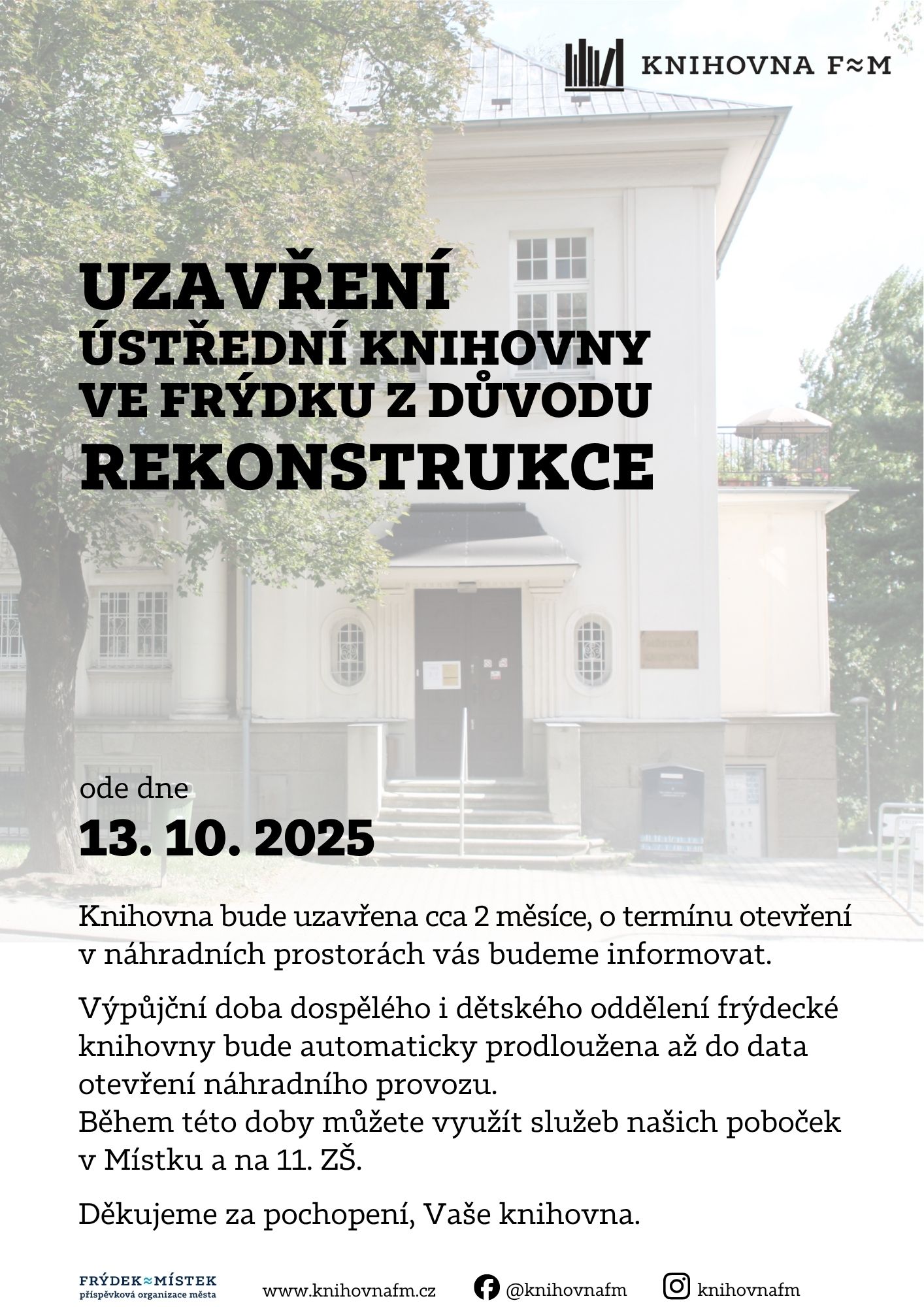 Ode dne 13. 10. 2025 je knihovna ve Frýdku na ulici Jiráskova na asi dva měsíce uzavřena. O přesném termínu otevření v náhradních prostorách vás budeme informovat.